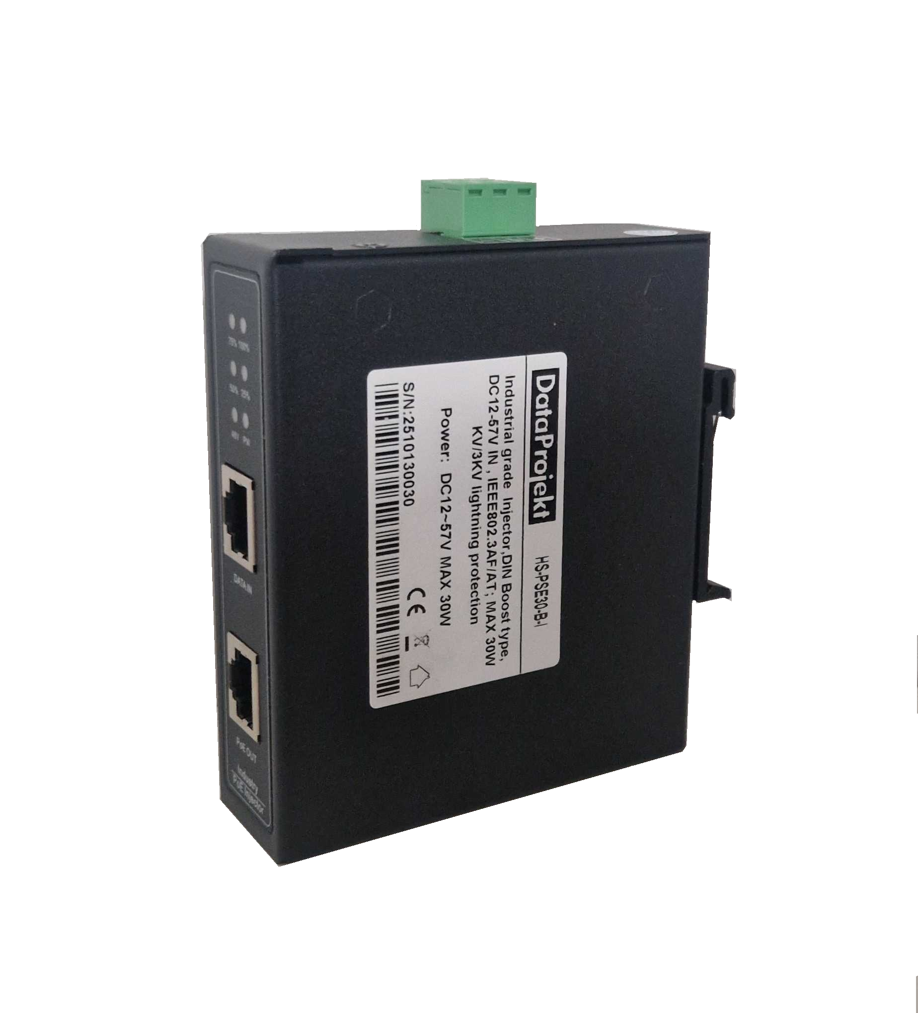 Industrial Injector,DIN type, DC37-57V IN , IEEE802.3AF/AT/BT; MAX 90W KV/3KV lightning protection